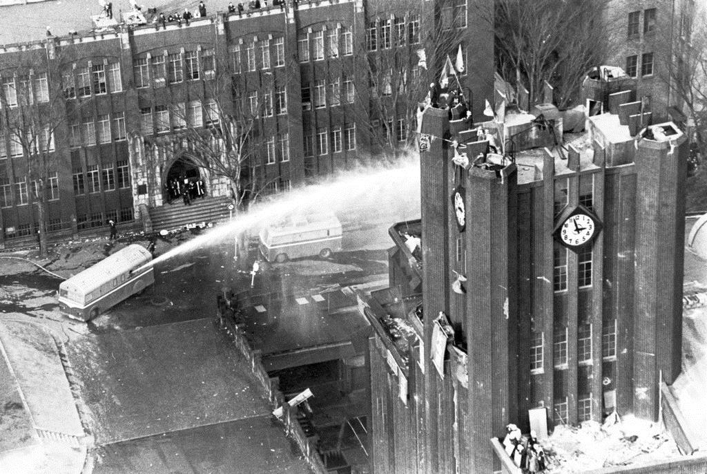 야스다 강당은 꼬박 하루를 버텼다. 기동대는 밤새 물대포를 쏘았다.